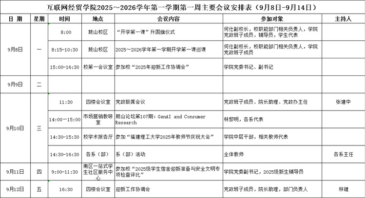 互联网经贸学院2025~2026学年第一学期第一周主要会议安排表(9月8日-9月14日)