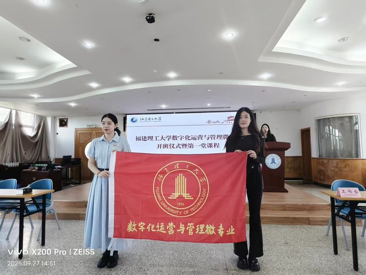 活动现场,第二届数字化运营与管理微专业的校企合作单位福建省六一八产业发展有限公司叶倩倩博士、福建正临企业管理有限公司董事长郑琳参加了开班仪式,寄语第二届微专业学生多参与课外实践,实现自我蜕变式成长,并为新一届学员颁发微专业定制学习笔记本。学院客座教授陈清福为第二届数字化运营与管理微专业的学生授第一课,并给予微专业学生1000元首笔奖学金。首届微专业学员代表分享了参与首届微专业课程相关经验,鼓励学弟学妹把握校企资源,提升实战能力。随后,首届班长向第二届学员代表授予班旗,象征数字化运营与管理精神的传承。活动期间,各国学员代表还实地参观了学院实训中心数字新媒体实践基地。