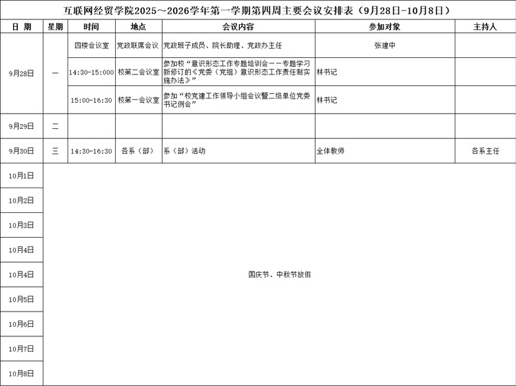 互联网经贸学院2025~2026学年第一学期第四周主要会议安排表(9月28日-10月8日)