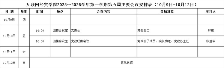 互联网经贸学院2025~2026学年第一学期第五周主要会议安排表(10月9日-10月12日)