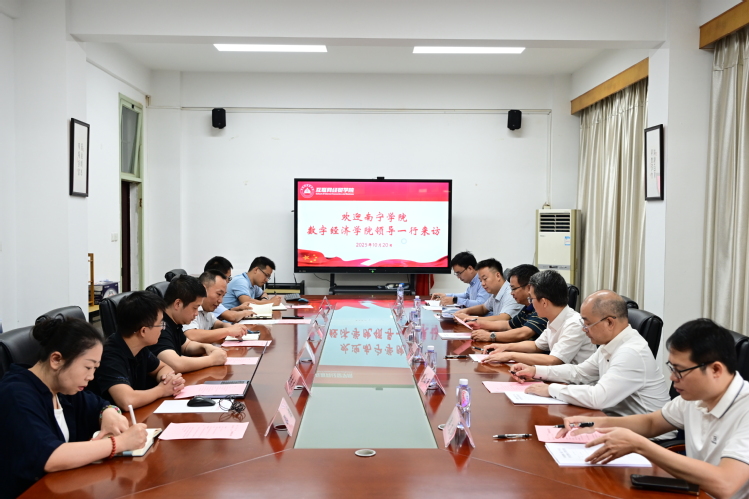 张建中对蒙永亨一行的到访表示热烈欢迎,并详细介绍了我院的办学特色、学科布局及科研成效。他强调,学院高度重视数字经济专业硕士点的建设与发展,期待以此次交流为起点,与南宁学院在人才培养、学科协同等方面开展务实合作,共同为服务区域经济社会发展注入新动能。蒙永亨对我院的热情接待表示感谢,并充分肯定了我院在数字经济专业建设与人才培养方面形成的鲜明特色和取得的扎实成果。他分享了南宁学院在发展数字经济专业过程中的实践经验与面临挑战。双方就未来合作路径、资源共享机制及项目推动方式等具体内容进行了深入探讨。