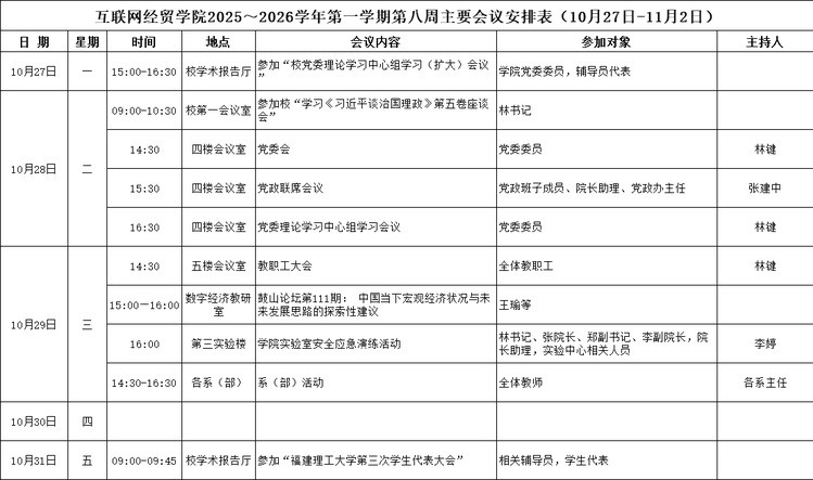 互联网经贸学院2025~2026学年第一学期第八周主要会议安排表(10月27日-11月2日)