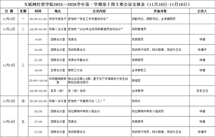互联网经贸学院2025~2026学年第一学期第十周主要会议安排表(11月10日-11月16日)