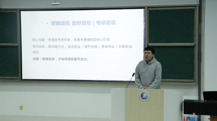 会上,江明围绕报考条件、招生计划、培养特色及科研平台等核心内容系统解读了学院2027年硕士研究生招生政策。张建中结合求学治学的切身经历与多年一线教学管理经验,从理性分析与情感激励双重视角出发,针对报考院校选择、备考节奏安排、心态调整方法及日常作息规划等方面做了备考策略辅导。2026届考研学生代表徐邦禄、苏林昊结合自身备考经历,分享了从初试备战到复试突围的实战经验。